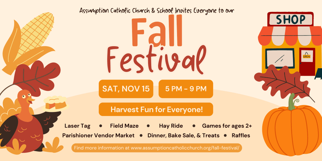 Join us for an evening of Harvest Fun for Everyone at Assumption’s Annual Fall Festival! Enjoy Laser Tag, a Field Maze, Games for all ages, Raffles, Hay Rides, Delicious Food, Sweet Treats, Beer & Wine, Tons of Prizes, and a Festive Market perfect for early Christmas shopping!