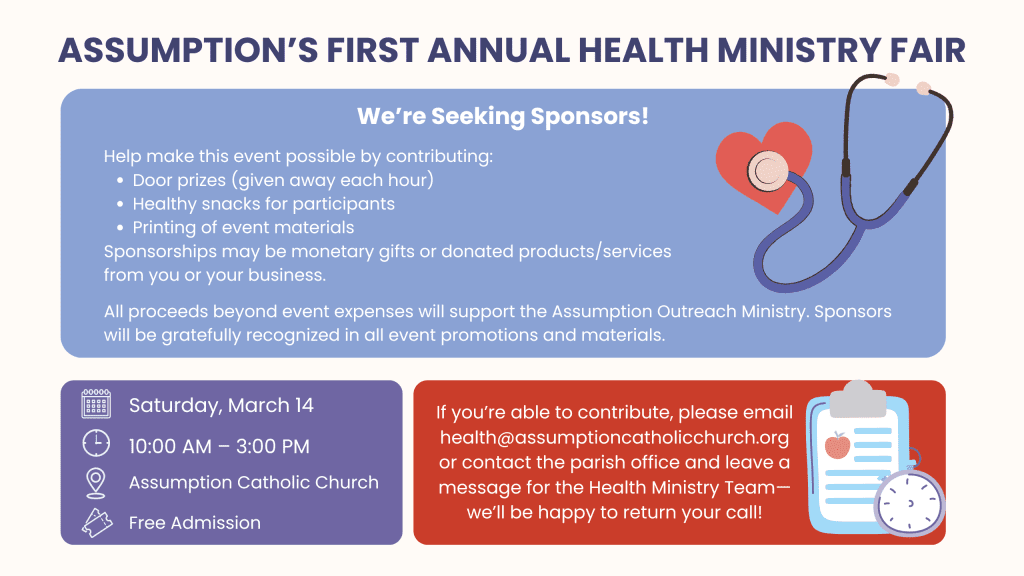 We’re excited to announce Assumption’s First Annual Health Ministry Fair on Saturday, March 14, from 10:00 AM – 3:00 PM! Admission is free, and the event will be supported entirely through generous donations.