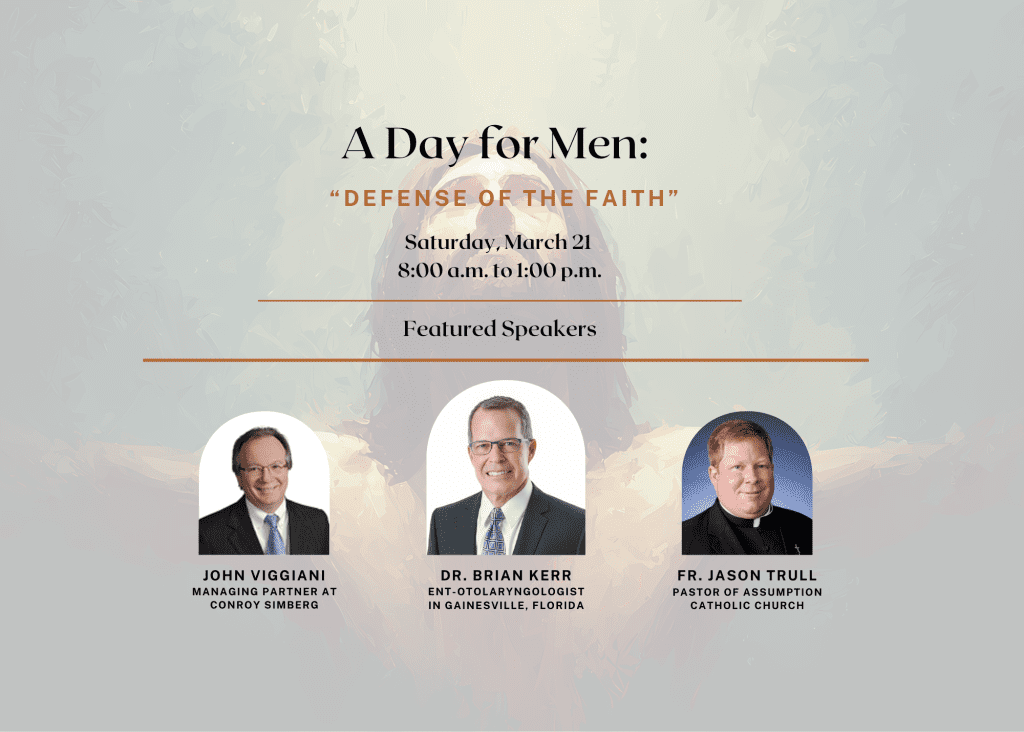 Men – Join us on Saturday, March 21 for a day of faith, learning, and fellowship. The event will begin with Mass at 8:00 a.m., followed by the Rosary and inspiring presentations on “Defending Our Faith” by John Viggiani, Dr. Brian Kerr, and Fr. Jason Trull.