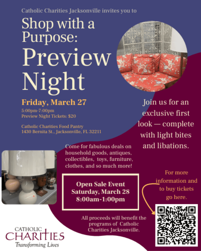 Join us on Friday, March 27 from 5:00–7:00 PM at the Catholic Charities Food Pantry (1430 Bernita St., Jacksonville) for an exclusive first look at our upcoming sale. Enjoy light bites and refreshments while browsing a wonderful selection of household goods, antiques, collectibles, toys, furniture, clothing, and more.